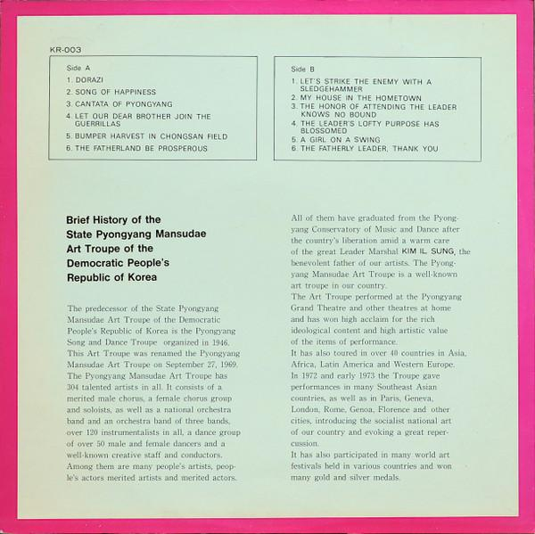 A1. Dorazi A2. Song Of Happiness A3. Cantata Of Pyongyang A4. Let Our Dear Brother Join The Guerrillas A5. Bumper Harvest In Chongsan Field A6. The Fatherland Be Prosperous B1. Let's Strike The Enemy With A Sledgehammer B2. My House In The Hometown B3. The Honor Of Attending The Leader Knows No Bound B4. The Leader's Lofty Purpose Has Blossomed B5. A Girl On A Swing B6. The Fatherly Leader, Thank You